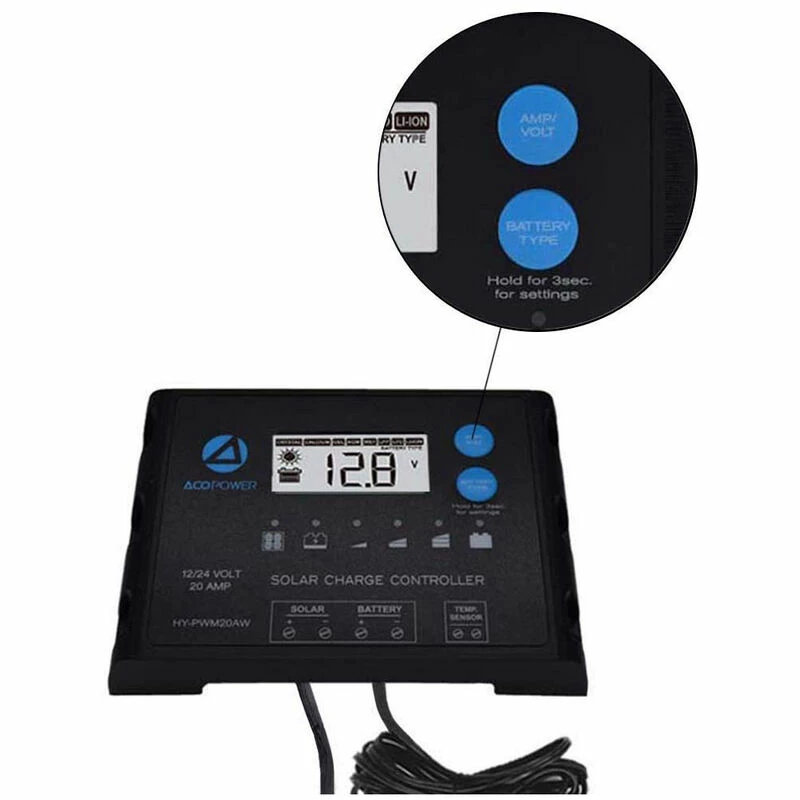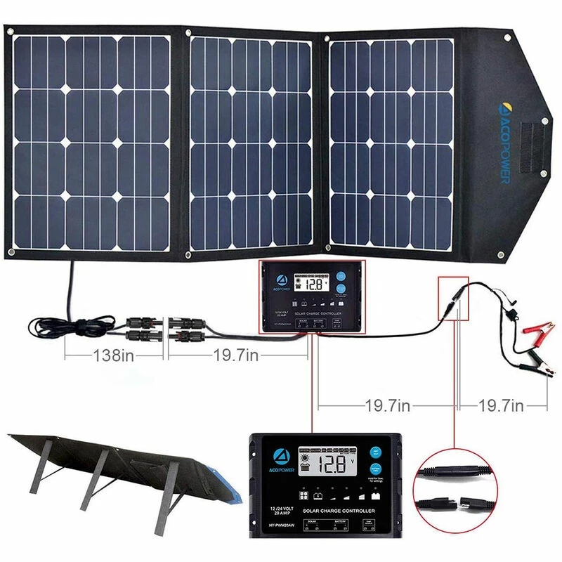 Clamp to your 12V batteries for automatic charging. Remove charge controller by disconnecting the MC4 connectors and connect the ACOPower generator for charging.