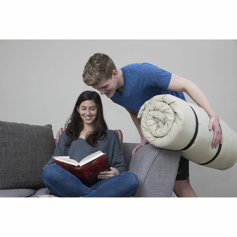 From the unexpected guest at home to your next camping adventure, the Duvalay consists of two pockets. The bottom pocket is a gold quality memory foam that molds and supports your body and the top pocket houses a hollow fiber duvet with a luxury polycotton cover. This ideal combination ensures you stay warm and have first class comfort and support wherever you choose to sleep. The duvet and pad cover are both removable and washable. Because the Duvalay is also reversible you can place two side by side to make it a double. The fit is not only snug and seamless, but the pads will not move apart. Simply unroll and use – straps and a convenient zipper bag are supplied for easy storage and transportation. Perfect for your Disc-O-Bed® L cot system.