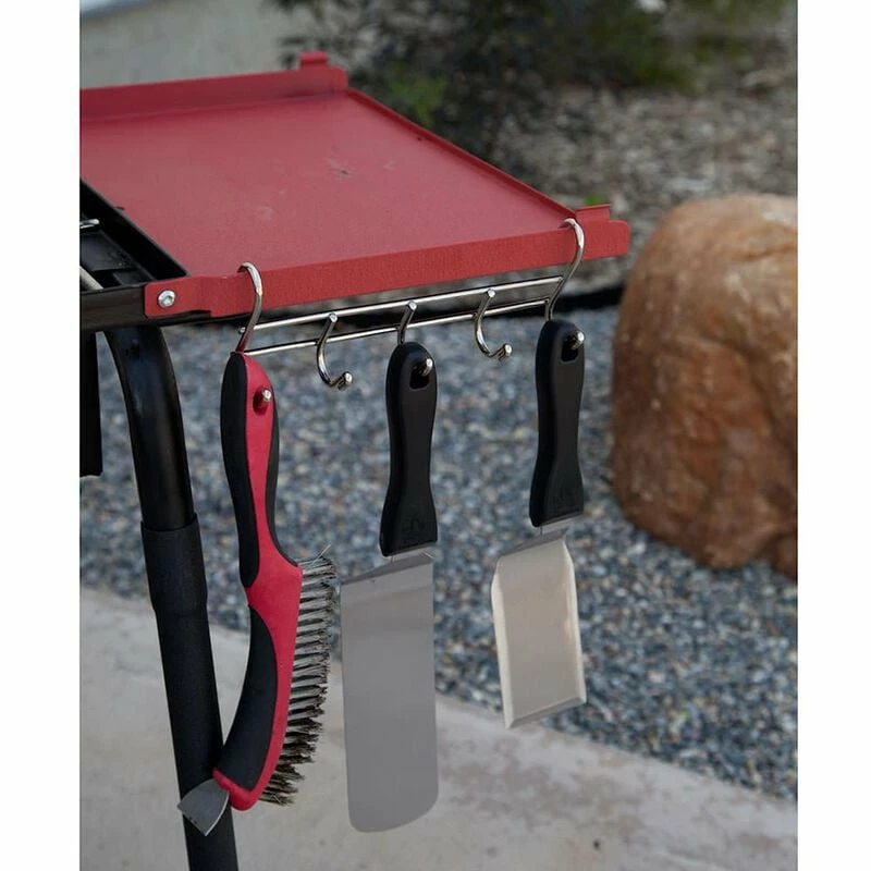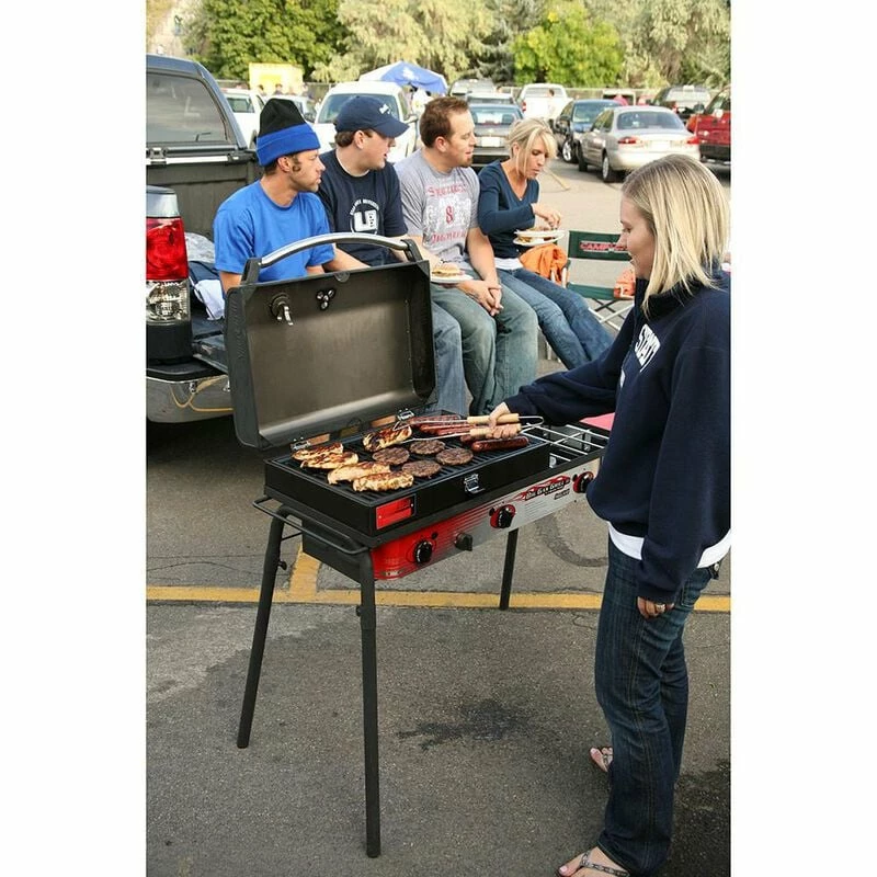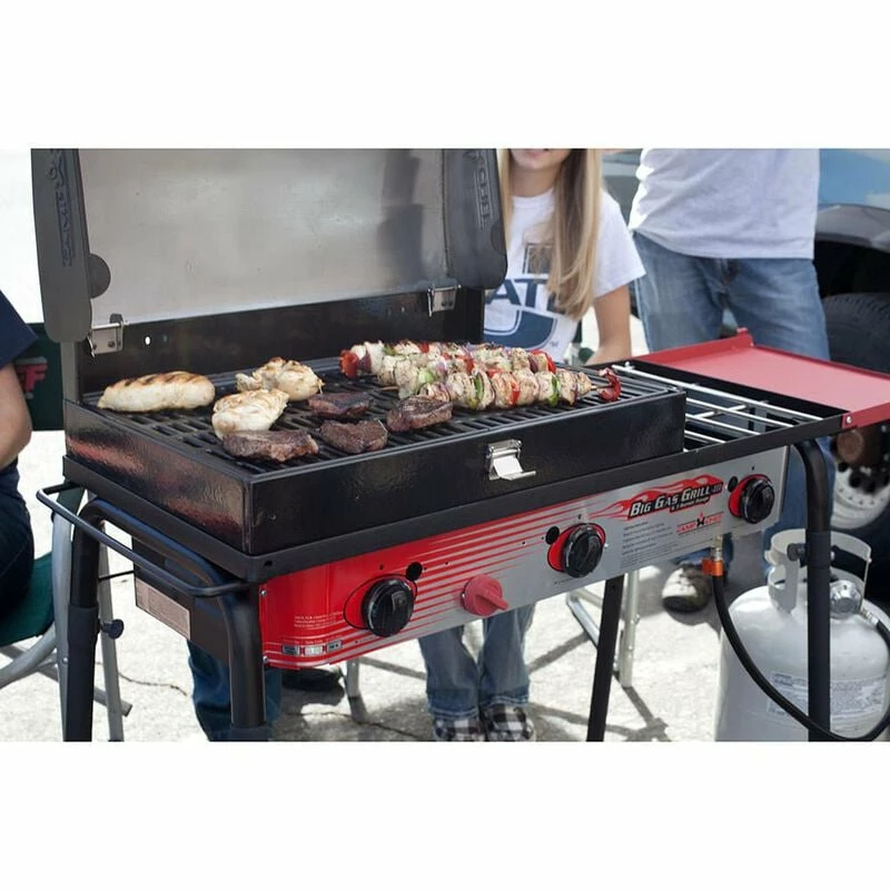 The Big Gas Grill 3 comes complete with side shelf and a barbecue box with vented lid that covers two burners. The BB-90L barbecue box with built-in thermometer has a hinged lid, can be easily removed for access to all three burners, and is also compatible with most other Camp Chef 3-burner stoves. Pre-seasoned cast iron grill grates in grill box use internal heat diffusion technology for even cooking. On the stove, three 30,000 BTU burners combine with a large 585 sq.in. cooking surface for extreme versatility. The portable stove has removable legs and matchless ignition, making it ideal for campground cooking. One-year limited warranty. Grill box measures 24″ x 15-3/4″ x 7″ and weighs 33 lbs. Stove Measures 38″ x 16″ x 32″ and weighs 49 lbs.