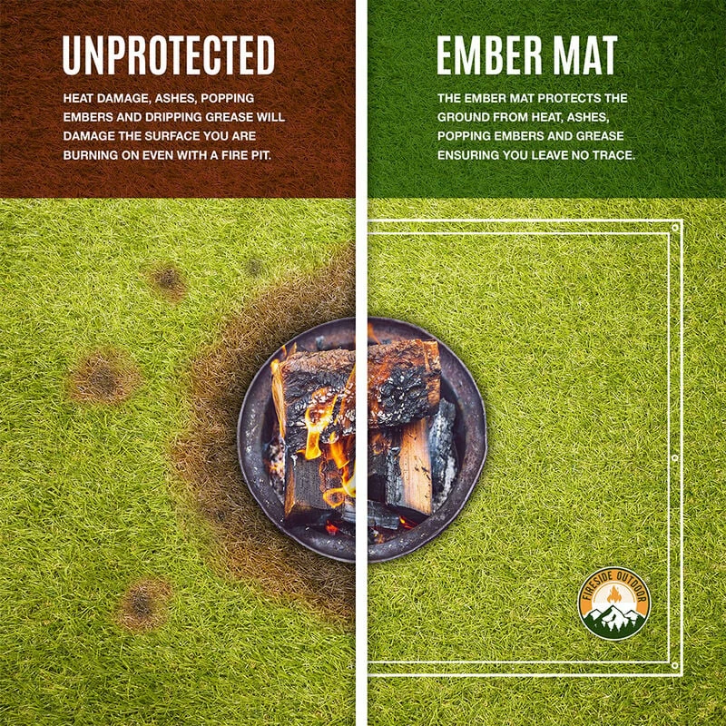 The ember mat features double-coated silicon making the mat easy to clean with reflective edging for safety at night. At 68″ x 60″, the ember mat gives great coverage for collecting the ashes, embers, or grease that can fall out of your fire pit or grill. The ember mat is also coated on both sides with a food-grade silicon. This means that run-away hot dog is still edible if it gets dropped onto the mat. Use a low impact fire pit/firepan such as the pop-up pit and the ember mat to help leave your campsite as clean as you found it.