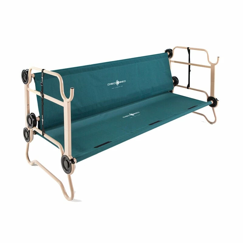 With the included set of stack adaptors you are able to place one cot on the other, so to maximize the number of sleepers per square foot. By quick action the system can be converted into a sitting bench during the day, a bunk or alternatively two single cots at night. Simply put, the Disc-O-Bed L offers you one system with many options – you get to choose.