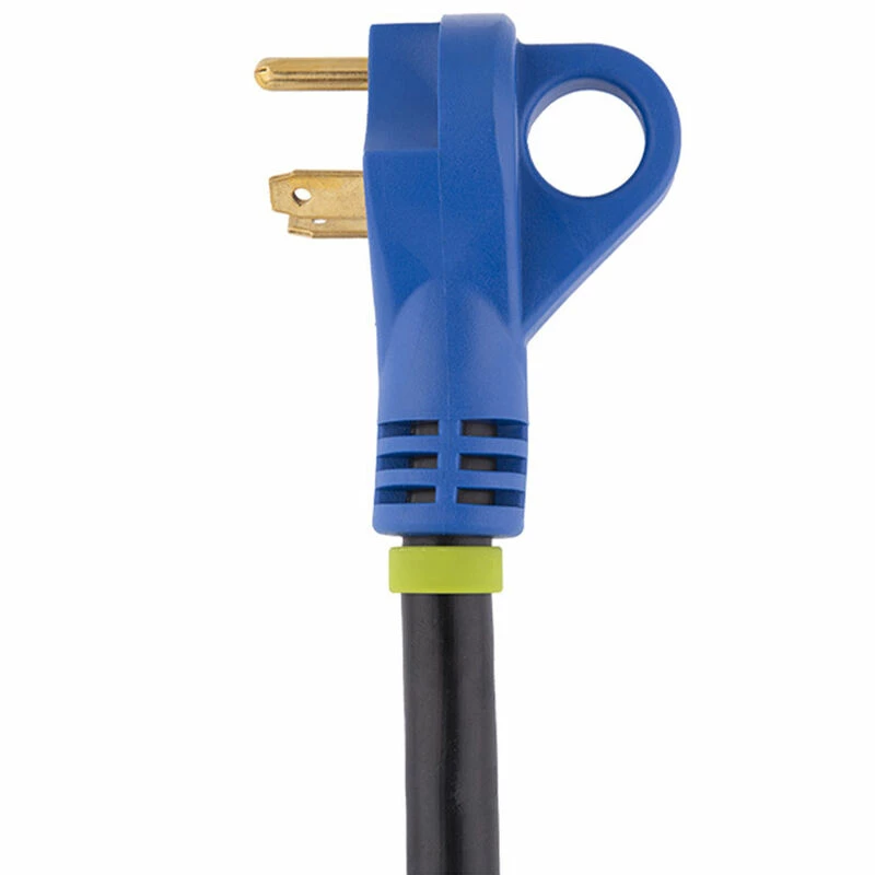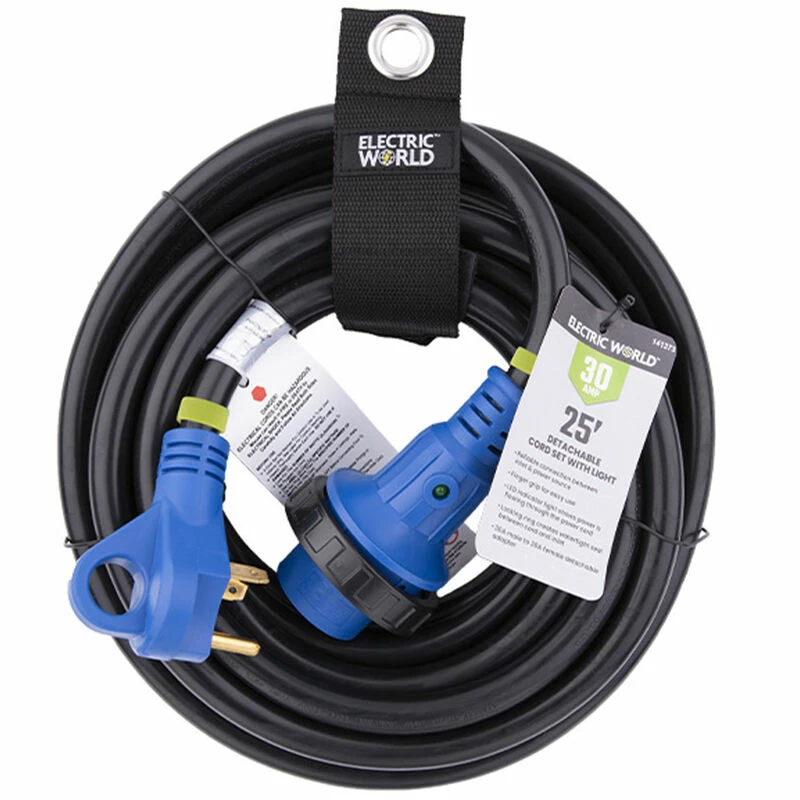 Electric World 30 Amp 25′ Detachable Cordset with Light connects between an inlet and a power source, enabling power to RVs. It comes equipped with an extra-wide grip handle, an LED indicator light, and features a heavy-duty cable designed for outdoor use. This cable is chosen for its superior quality, durability, and resistance to UV rays. Additionally, the molded ends of the cord ensure a secure and waterproof connection between the cord and electrical contacts, enhancing its reliability. When attached to the inlet, the threaded ring forms a seal that effectively protects against weather conditions.