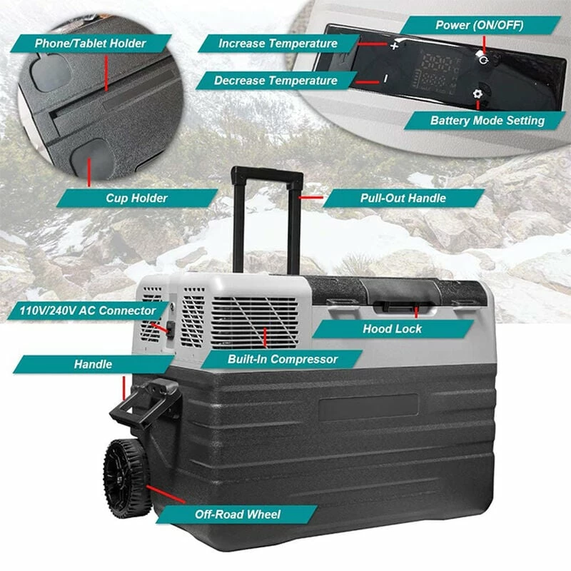 Great for the outdoor trip. Large space and down to -4°F(-20°C) temperature can keep almost anything fresh during a long road trip.Included 12V/24V DC car adaptor, and 110V/220V AC adaptor