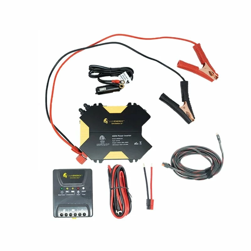 The Savanna IV 400W Inverter connects various devices using the 2 AC and 4 USB (2 @ 2.4A, 1 @ 1A, and 1 @ 0-2.4A) outputs. It connects easily to an energy source or battery and has an output voltage of 110V AC (±5%) / 60Hz.