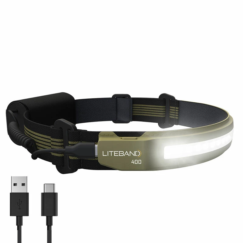 The Liteband ACTIV 400 LED Headlamp is the first 210° wide beam, low-profile headband-style headlamp. Lightweight with an adjustable strap, Litebands provide long-lasting comfort for all day wear. The headlamp delivers 400 lumens of ultra-bright light with an 1800 mAh lithium-ion USB-C rechargeable battery, and 36 hours of light on low setting. Features 5 light modes including high, med, low, red, and pulse for maximum versatility. With a weatherproof rating of IPX4, the ACTIV 400 is perfect for camping, hiking, running, fishing, and other outdoor activities. Professionals will enjoy the lightweight adjustable fit for hard hats and helmets.