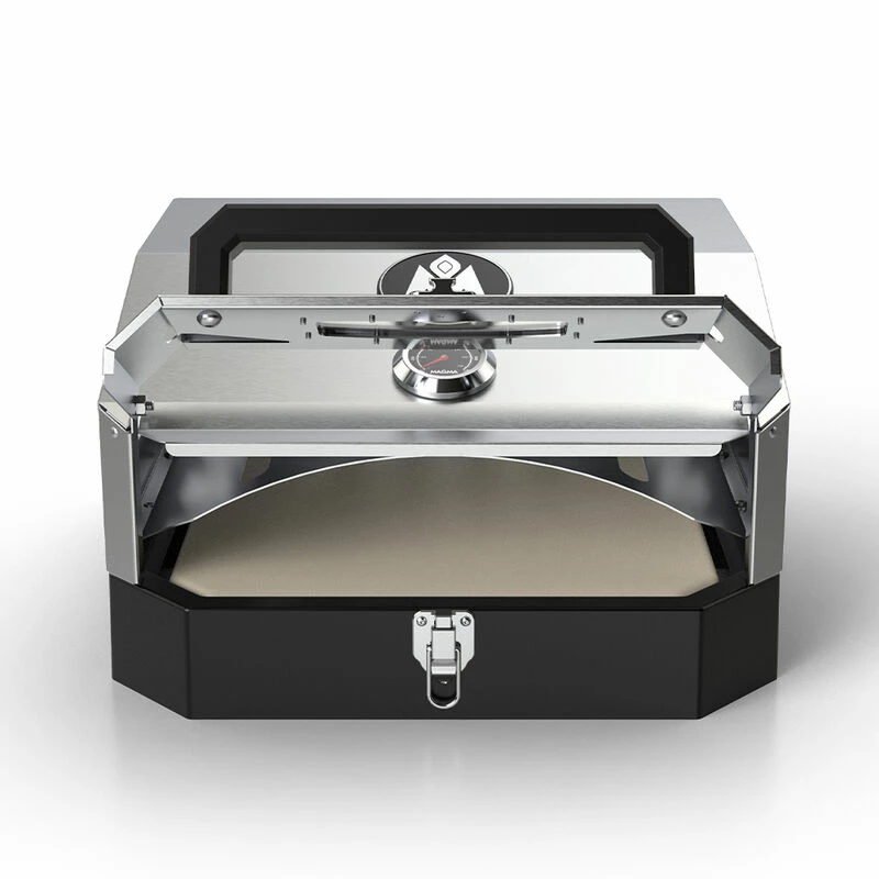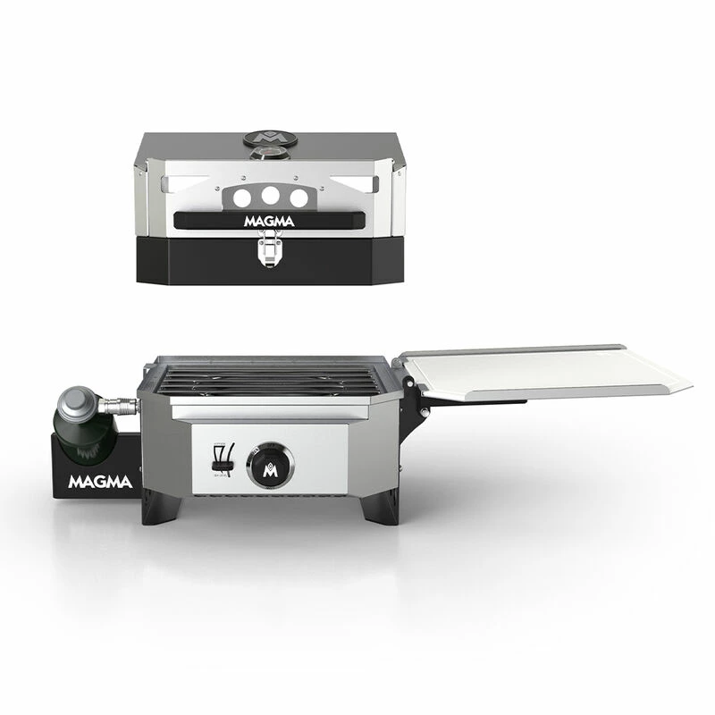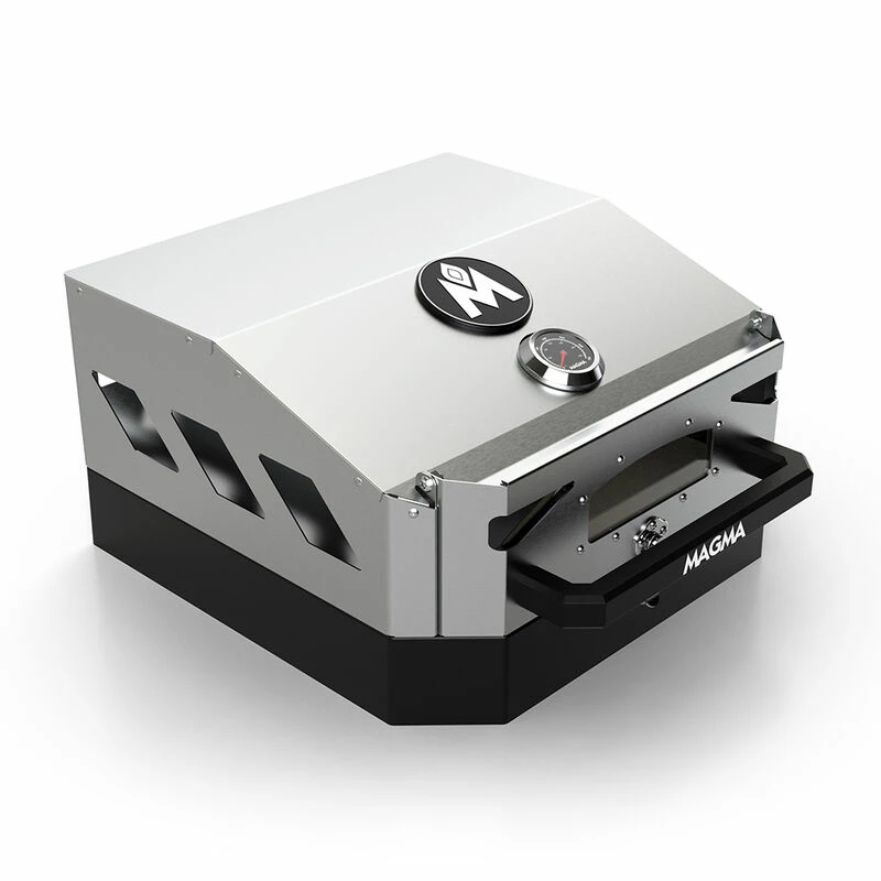 The Magma Crossover Pizza Top is made from 304 brushed stainless steel and a cast aluminum base. The non-corrosive, cast aluminum base prevents heat distortion to maintain a perfect fit with the Firebox (not included). The Pizza Top includes a curved upper inner liner to melt all the delicious pizza toppings and a pizza stone for a crispy crust. The lid includes a thermometer and locks into place for easy transport. This pizza oven can reach temperatures of up to 700°F and can quickly cook up a fresh pizza in no time. Now you’re finally able to cook up the perfect pizza while tailgating or out on the road in the RV.