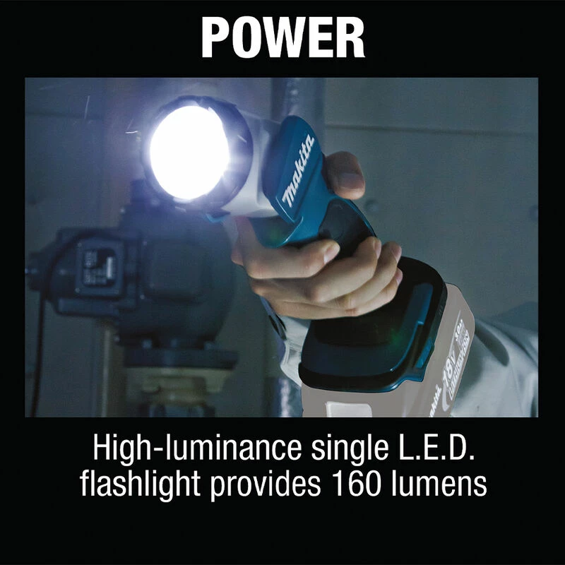 The 12-position aluminum pivoting head provides added versatility, with a durable design engineered for job site conditions. A metal hang-hook provides added convenience. The flashlight has a slim, compact design at 10-3/4″L and weighs only 2.1 lbs. (with 18V LXT battery, sold separately).