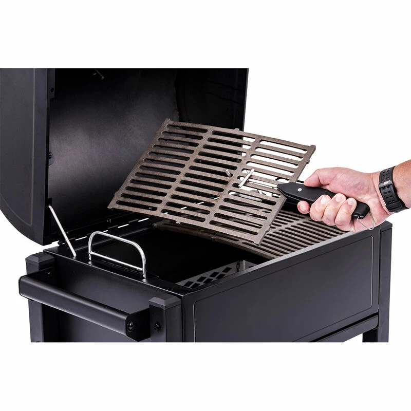 - Height-adjustable charcoal tray and large air dampers for temp control