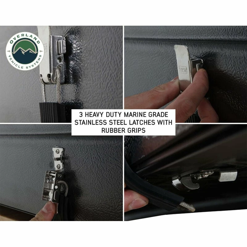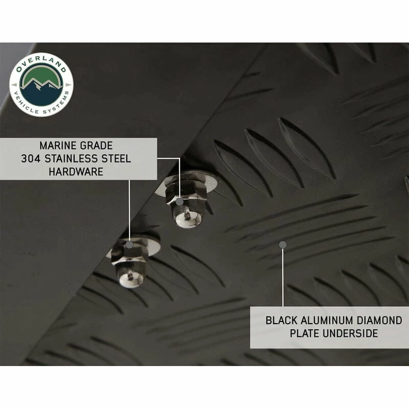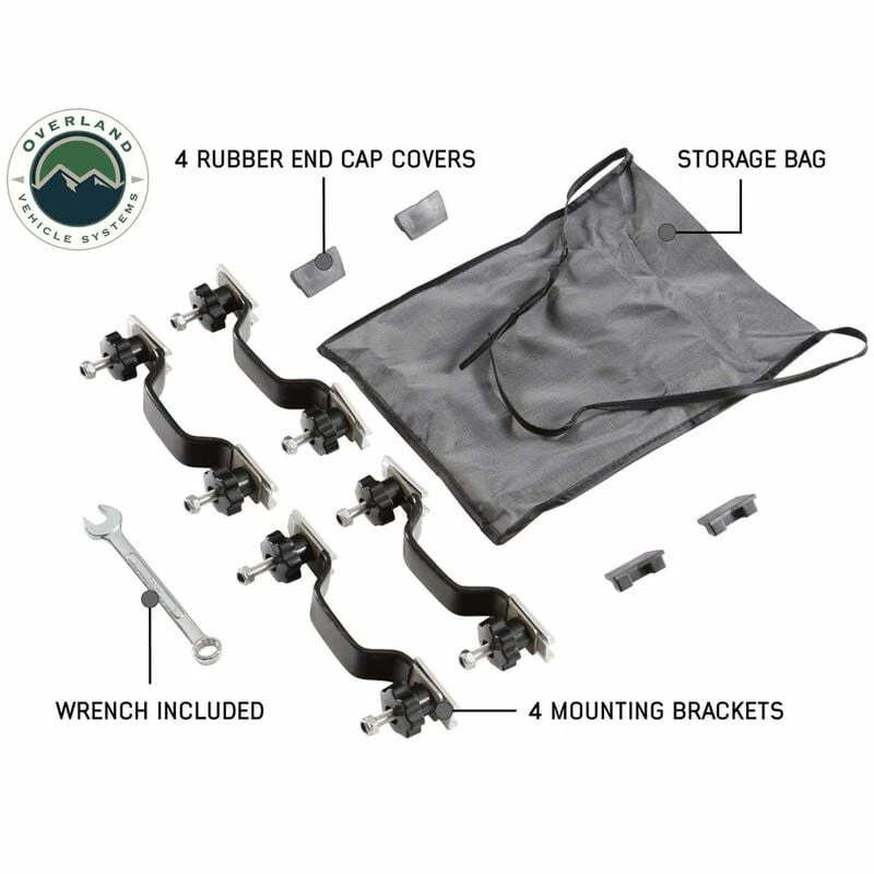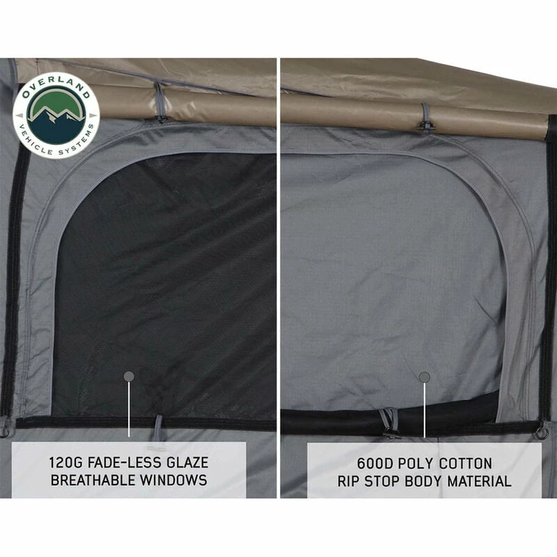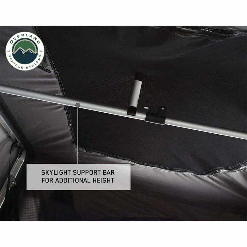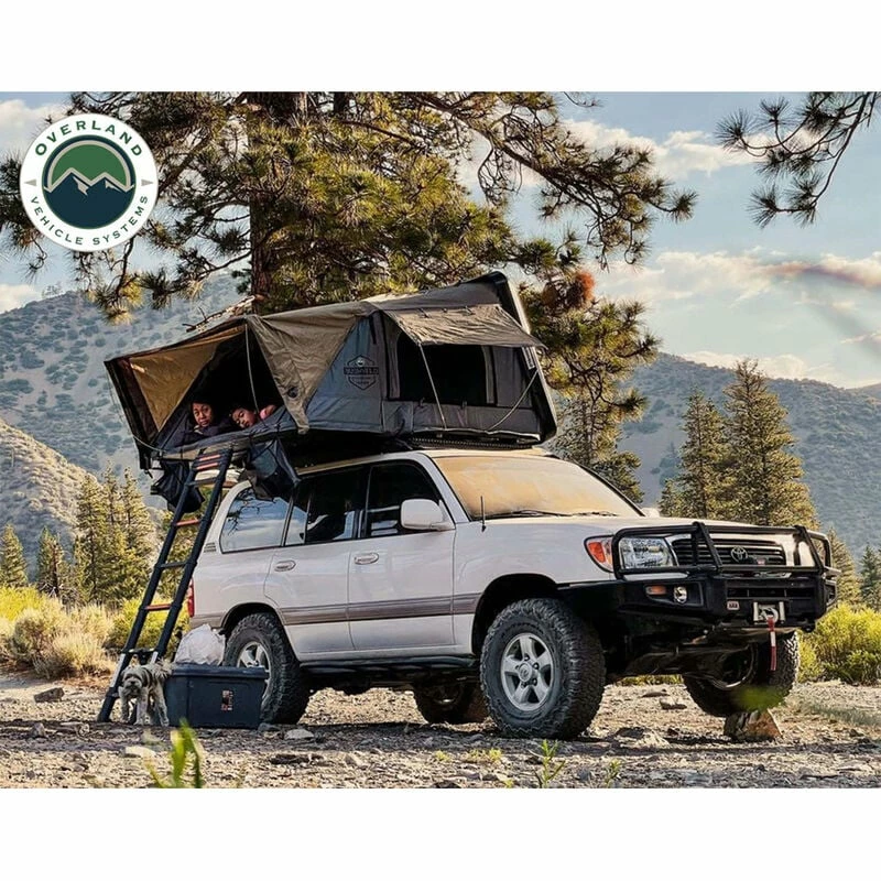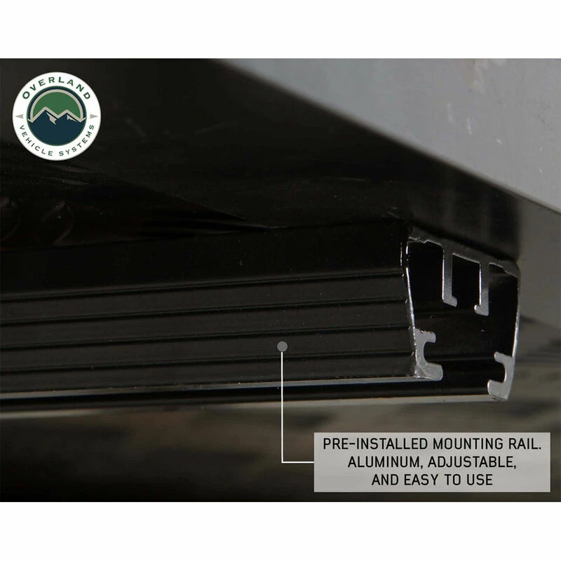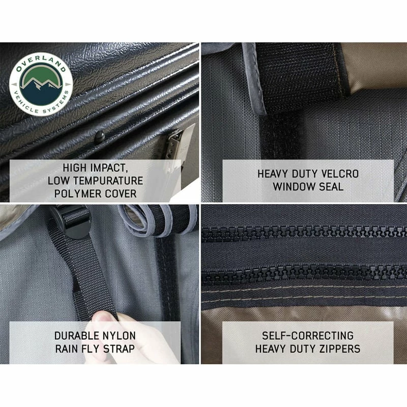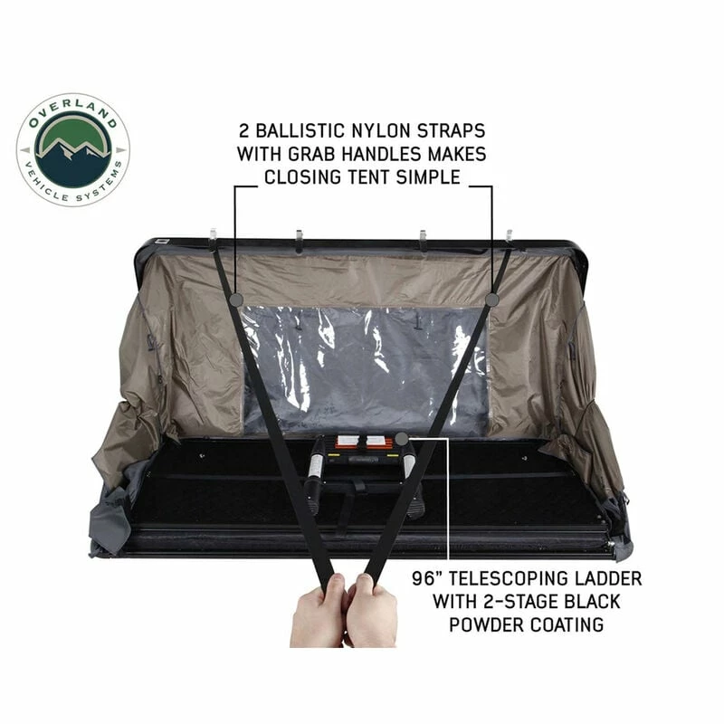 The Overland Vehicle Systems Bushveld II Hard Shell Rooftop Tent features double 600D ripstop body material with a 420-oxford ripstop waterproof rain fly cover. The fabric has a UV rating of PU 3500. The hard shell cover is waterproof and made from a single-piece polymer that is designed to last. All the latches and hardware are marine-grade 304 stainless steel. The 96″ ladder is made from aluminum and has a 2-stage black powder coating. The mounting channels are easy to use, adjustable, made from aluminum, and are preassembled to make installing your Bushveld II Tent easy. The weatherproof seal is military grade. The Overland Vehicle Systems Bushveld II Hard Shell Rooftop Tent can be closed using the ballistic nylon pull strap. The base is insulated and has a built-in anti-condensation layer along with a black aluminum diamond plate underside.