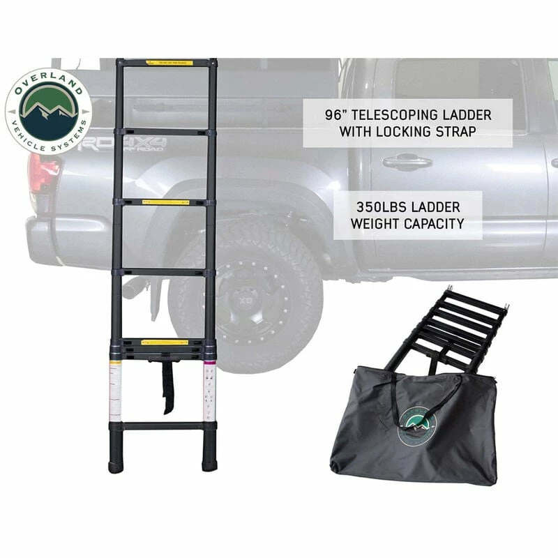 • Ladder: 96″ Telescoping Ladder with Locking Strap and Steel Double Sheer Attachment Hinges