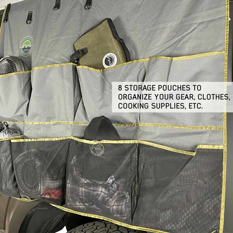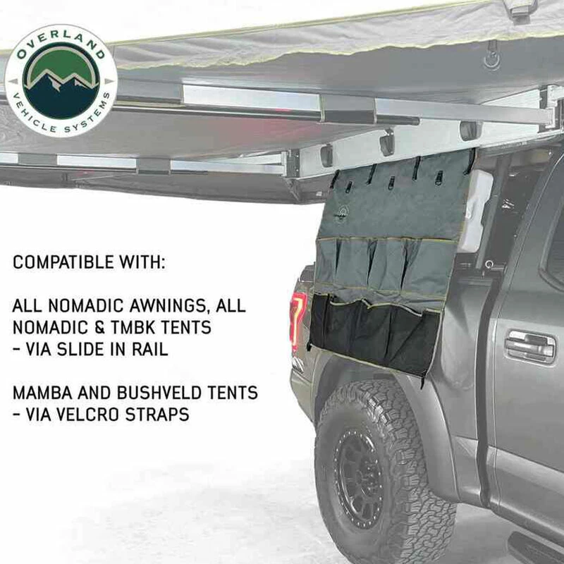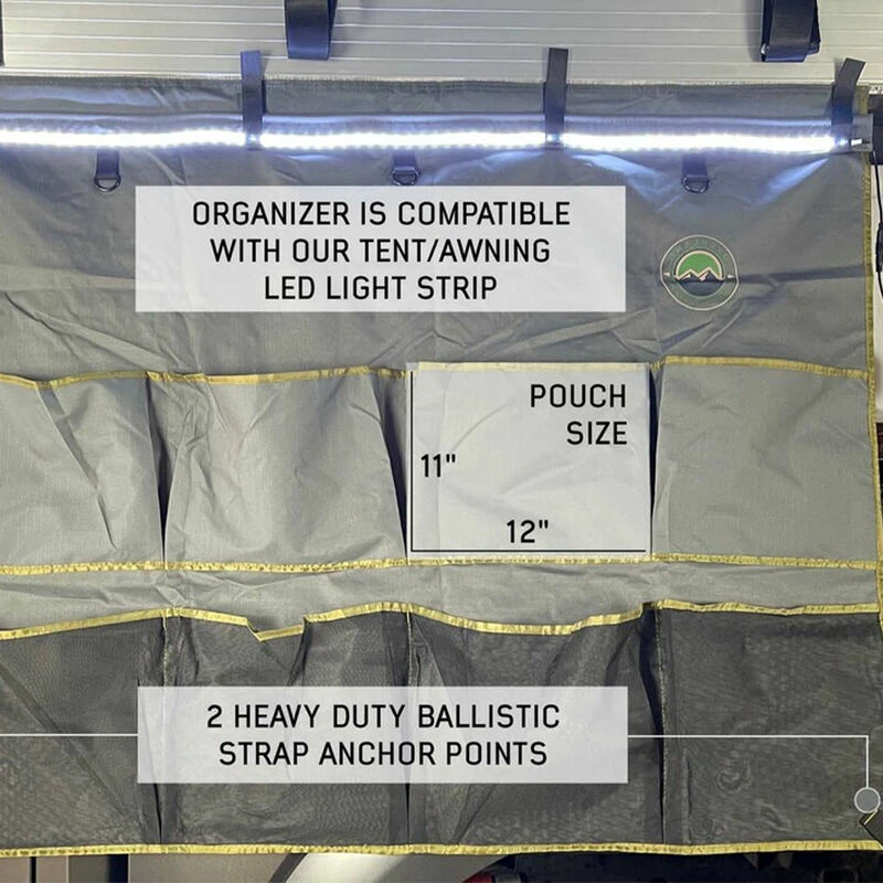 The Overland Vehicle Systems Camp Organizer has 4 mesh see-through pouches and 4 non-see-through pouches for a total of 8 pouches. The pouches measure 11″ x 12″. The Camp Organizer can be slid onto the C-channels or installed using the two supplied Velcro straps. Attached to the Camp Organizer are 3 D-rings for attaching additional gear for camping storage. Includes a storage bag.