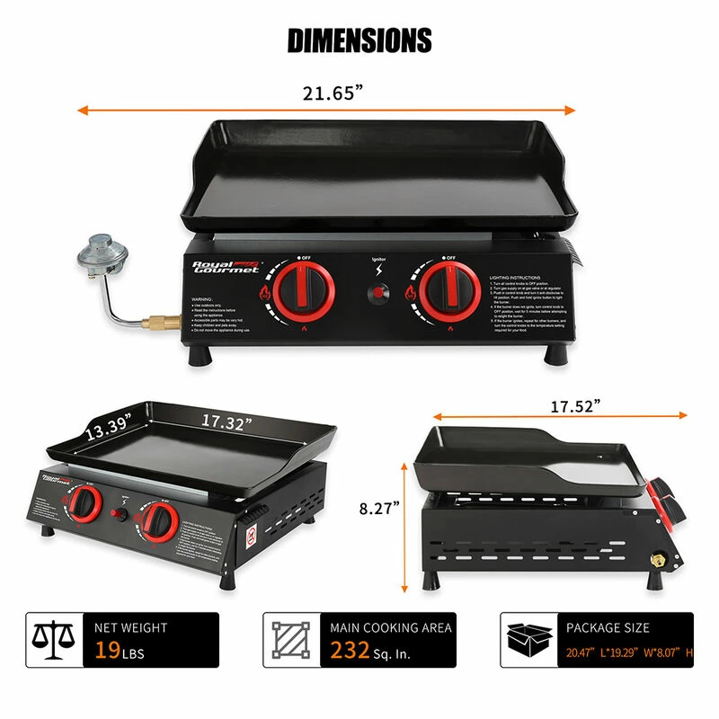Pre-seasoned porcelain-enameled steel griddle top with a 232 sq. in. cooking surface accommodates 7 asparagus spears, 4 bacon strips, 2 burgers, 2 eggs, and a steak all at once. Feeds 2-3 people easily.