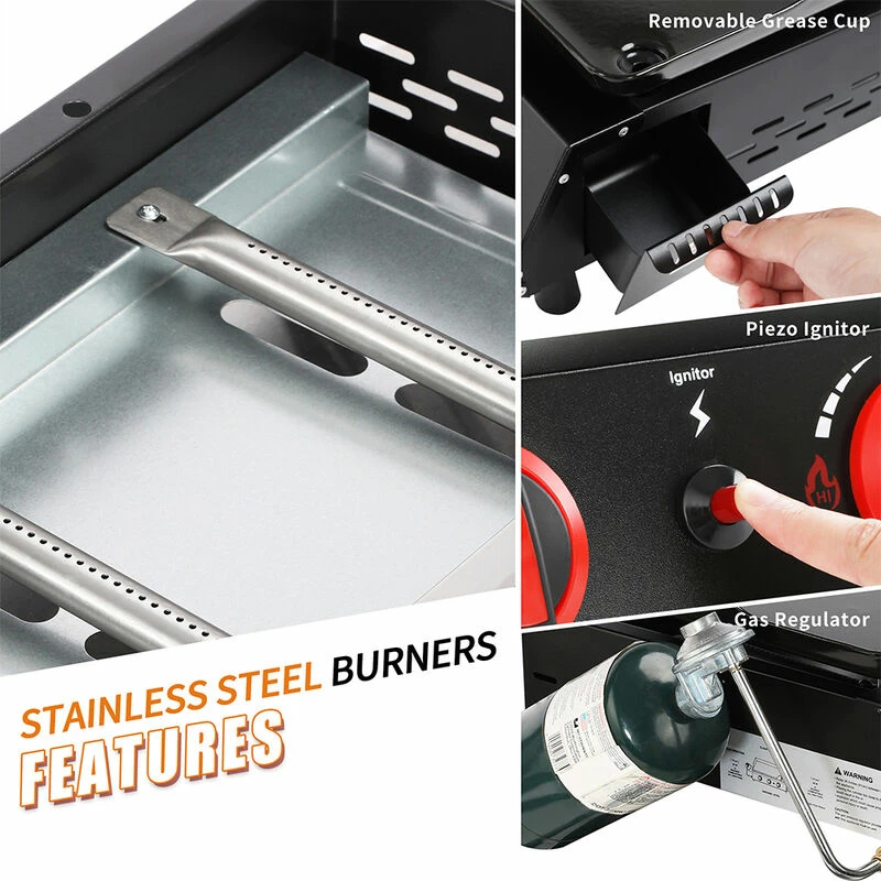 This portable grill features 2 stainless steel burners that emit up to a total of 16,000 BTUs of heat (8,000 BTUs each), which provide rapid and even heat to 2 independent temperature zones.