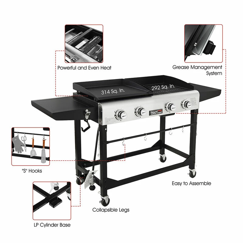 - Two individual cooking zones with 292 sq.in. grill and 314 sq.in. griddle