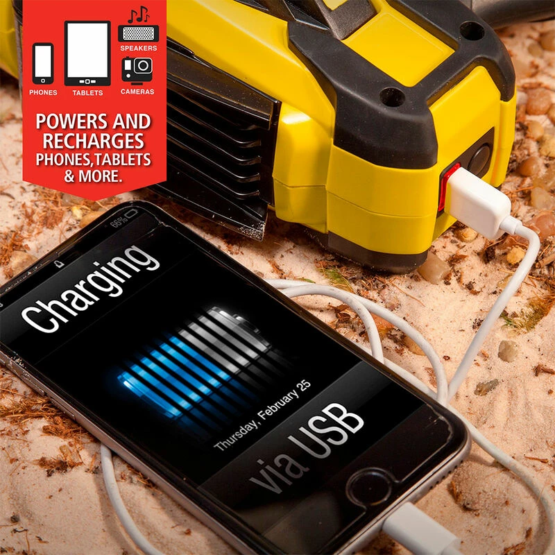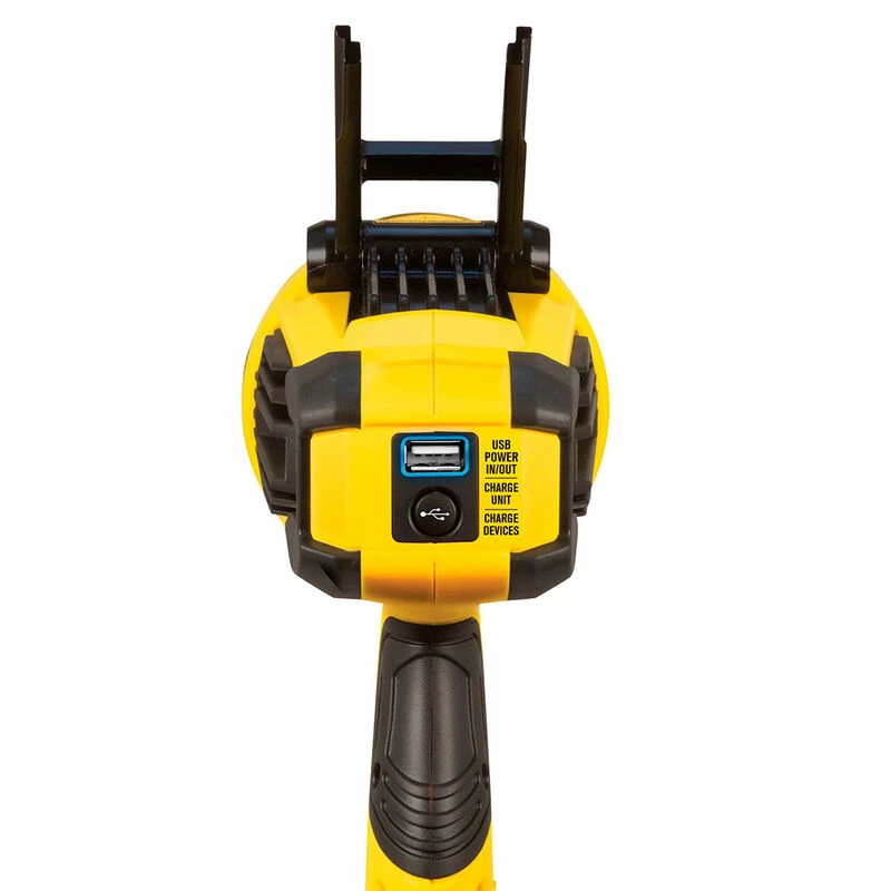 The Stanley FatMax Spotlight has a USB port, so you can charge mobile devices. It comes with both AC and DC charging adaptors so you can recharge at home or inside a vehicle. A rugged pistol-grip handle offers a convenient and comfortable grip, and the locking, pivoting stand and trigger lock provide hands-free operation. Note: The FatMax SL10LEDS is not intended to be submerged in water.