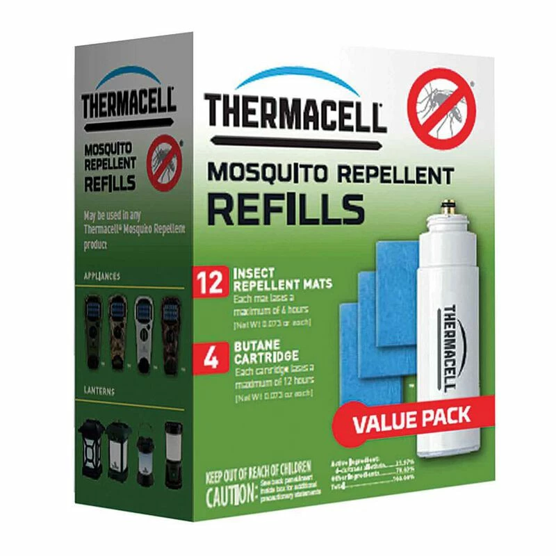 Provides everything your ThermaCell Mosquito Repellent Unit needs to provide hours of spray-free, invisible, and odorless protection from mosquitoes. Refill kit fits all ThermaCELL models. Each butane cartridge lasts up to 12 hours, with each mat providing up to 4 hours of protection. Refills can be stored for long periods of time, including between uses. Includes 12 mats and 4 butane cartridges (up to 48 hrs. of protection).