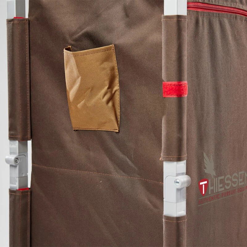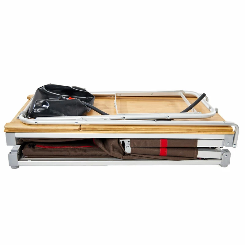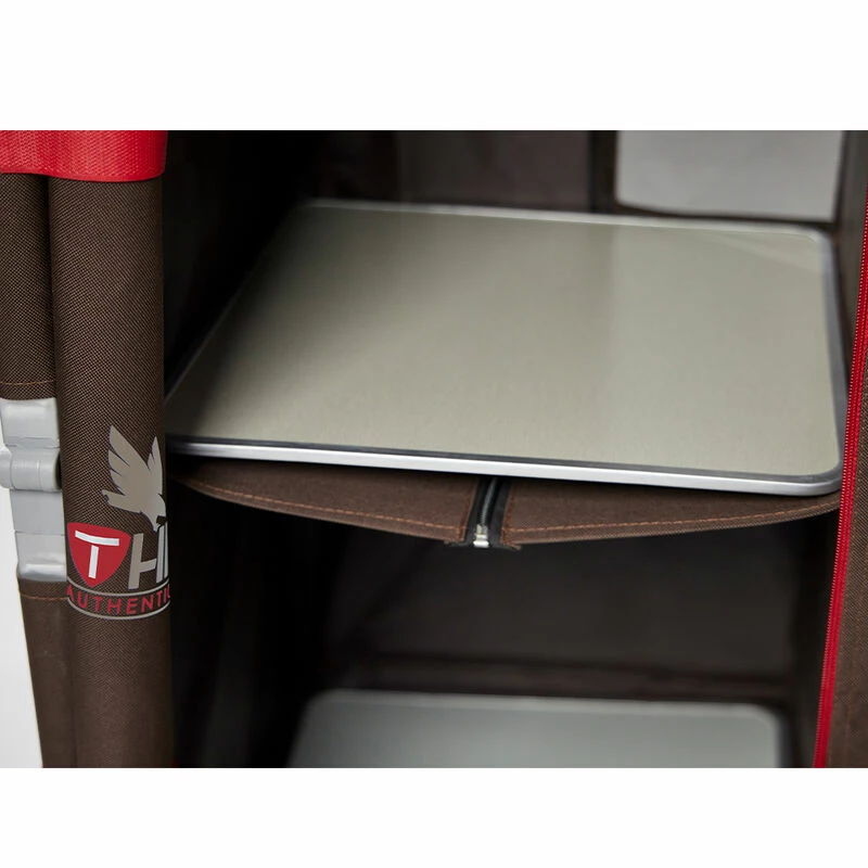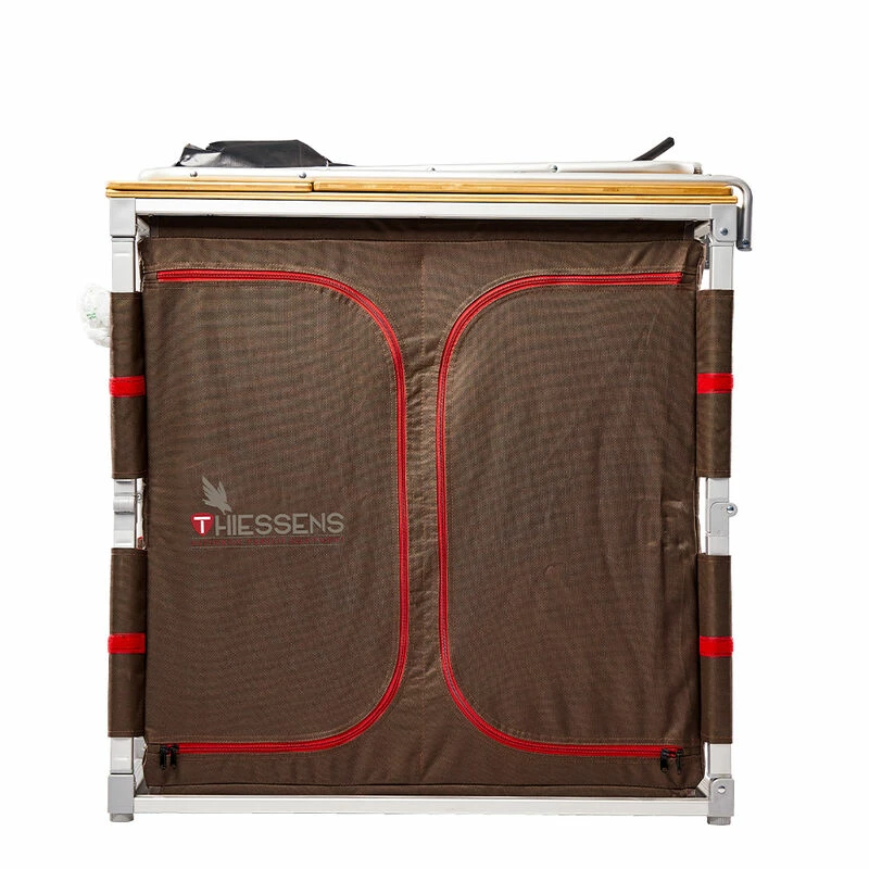 Take the “rough” out of roughing-it with the Thiessen’s Foldable Camp Kitchen. With an extra-large bamboo counter space, the Thiessen’s Camp Kitchen makes prepping your next wilderness-inspired meal as easy as cooking at home. Plenty of weather-resistant storage space may be the excuse you need to stay out a little longer. The Camp Kitchen includes premium bamboo counter tops, a collapsible sink, built-in trash bag holder, storage pockets, a durable fold-out frame, adjustable shelves and feet, a coated steel windscreen, and carry bag.
