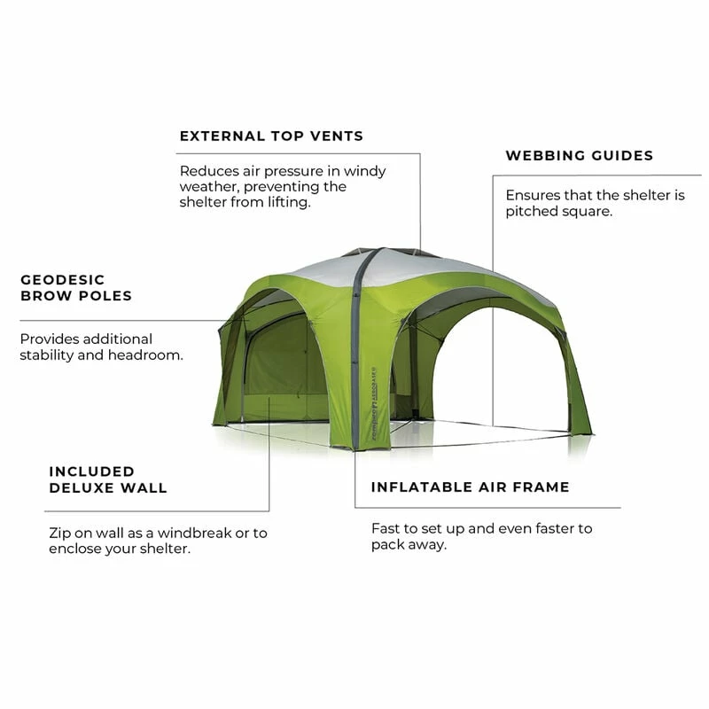Dome design. Double seal boston valve. External inflation points. Guide straps. Inflatable air frame. Semi-geodesic. Single point inflation. Stabilizing brow poles. Welded cross tube.
